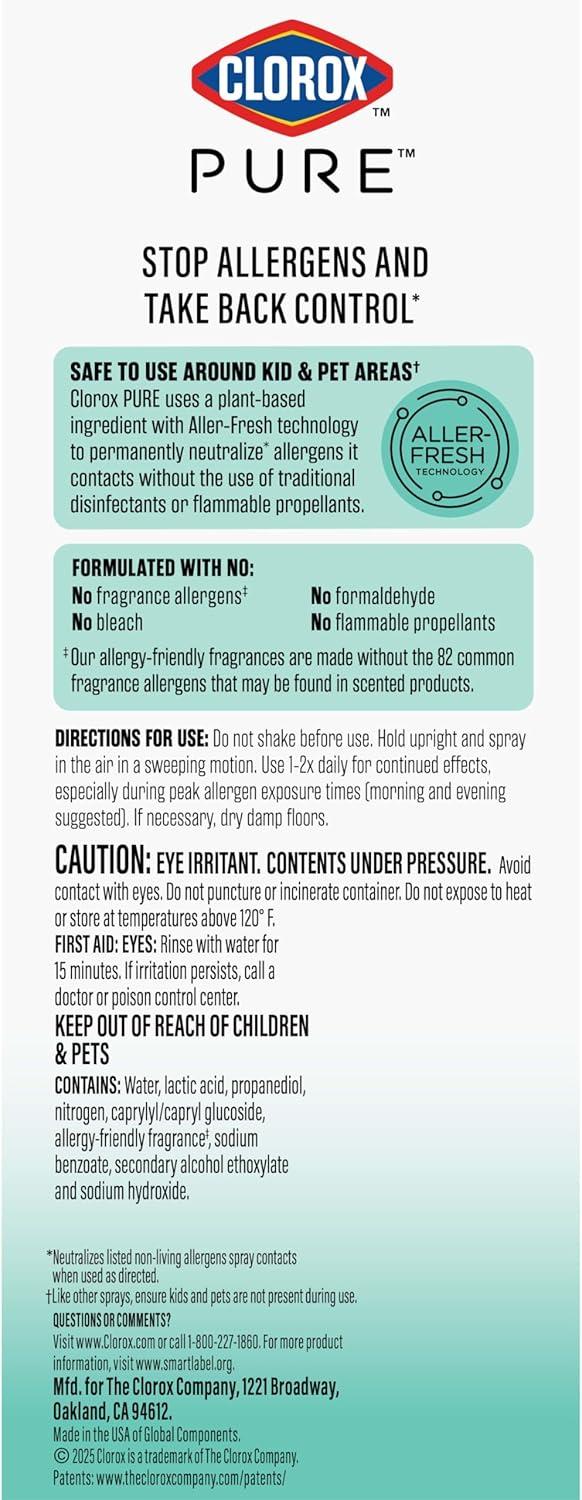 Stop allergens before they become allergies (1) with Clorox PURE Allergen Neutralizer Daily Air Spray. Developed with allergists, it neutralizes allergens like non living pet dander and pollen. Clorox PURE is powered by a plant based active ingredient using Aller-Fresh Technology. The allergen free Clean Breeze scent freshens without the use of the 82 most common fragrance allergens that may be found in scented products. Safe to use around kid and pet areas (2), Clorox PURE spray contains no bleach, formaldehyde or flammable propellants. Make your home allergy prevention routine easier with Clorox PURE. (1) Neutralizes non living pollen and pet dander spray contacts when used as directed. (2) Like other sprays, ensure sensitive individuals, like kids and pets are not present during use. Do not use around birds. (3) Our allergen free fragrances are made without the 82 common fragrance allergens that may be found in scented products.