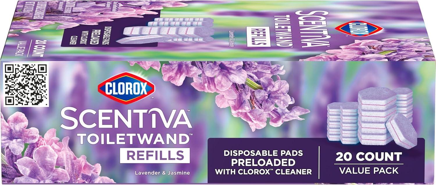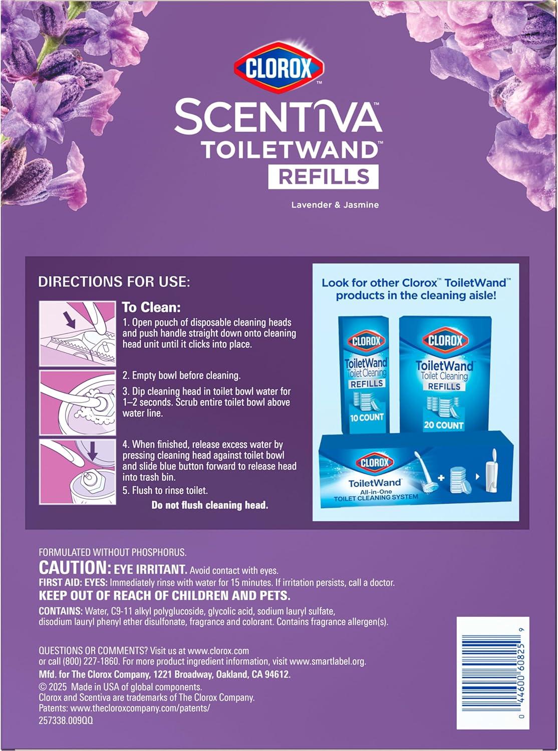 Clorox Scentiva ToiletWand Refills combine the trusted cleaning of Clorox with the refreshing scent of Lavender and Jasmine for an elevated cleaning experience. Clorox Scentiva scents are well crafted, curated and inviting blends that make a sophisticated addition to your cleaning products. Each disposable scrubbing pad is preloaded with Clorox Cleaner that powers through hard water and lime stains 2X faster than when using a toilet brush with manual toilet bowl cleaner. Designed for optimal reach, hexagonal shaped scrubbing pads conform to hard to reach areas like under the rim. The floral scent neutralizes odors without the bleach smell. Use this non abrasive formula to clean a variety of surfaces, including porcelain, chrome, enamel and synthetic marble. Never touch an icky toilet brush again: disposable scrubbing pads conveniently pop off into the trash so you can toss the mess every time. Designed for use with the Clorox ToiletWand handle (sold separately).